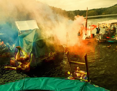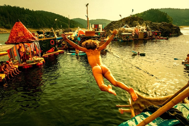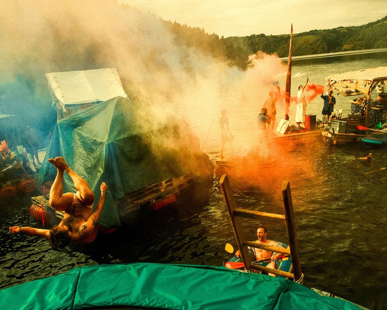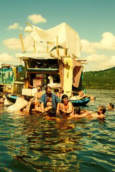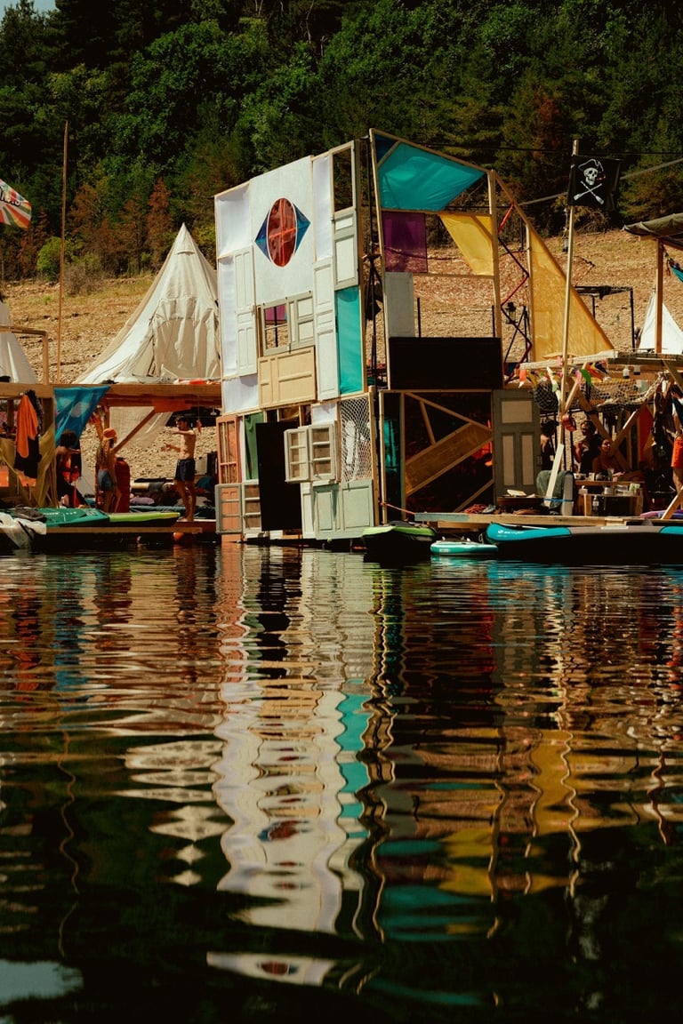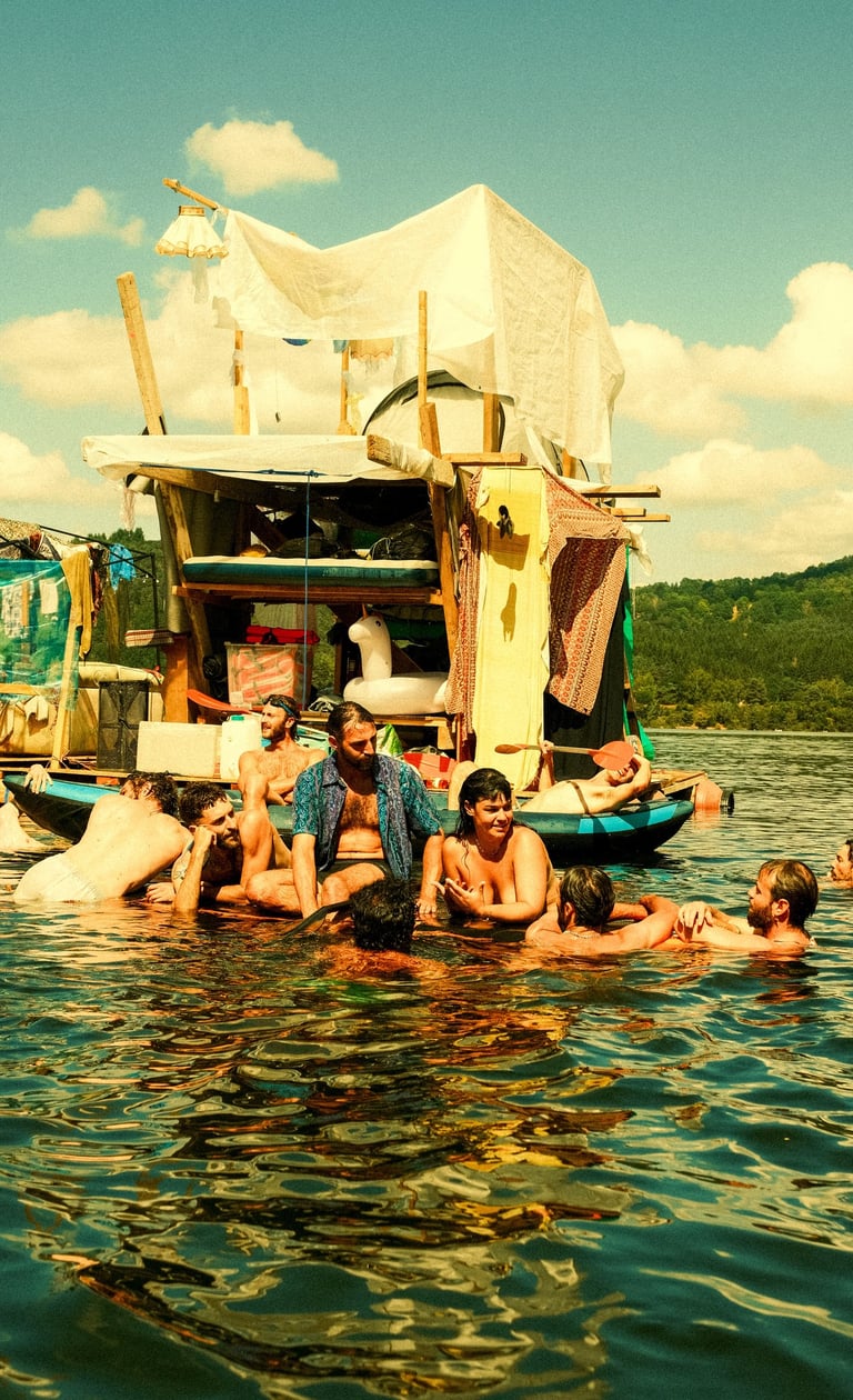 Tutto Blu est un rassemblement artistique sur l’eau. Chaque été, notre village flottant dérive sur un grand lac du Cantal.